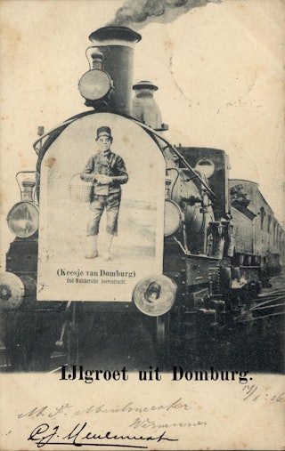 Vervolgens werd Keesje op allerlei plaatsen afgebeeld. Bijvoorbeeld op een kaart van een ‘locomotief nabij Domburg’.
