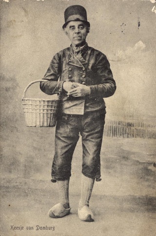 De man op de foto is op een heel aantal op elkaar lijkende foto’s in het Zeeuws Archief te vinden. Het verhaal gaat dat ‘Keesje van Domburg’ (1832-1911) een man was die zijn hele leven kleding bleef dragen uit de tijd toen hij zelf een jongeman was. Geleidelijk aan raakte die stijl volledig uit de mode en werd hij een bezienswaardigheid.
