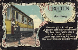 Maar ook de inhoud van de kaart laat een voor Domburg typerend plaatje zien: een tram die op het punt van vertrekken lijkt te staan.