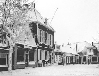 Afbeelding: Haamstede, Ring in de sneeuw. Links naast het gemeentehuis de Végéwinkel van Adr. van der Zande. 1962. Zeeuws Archief, Beeldbank Schouwen-Duiveland, nr W-0154.